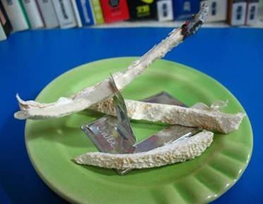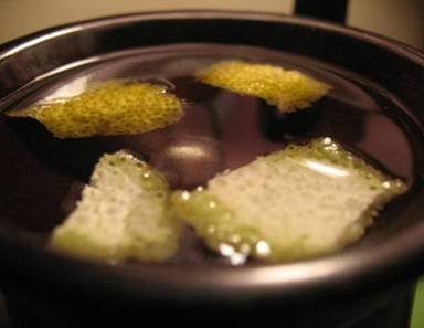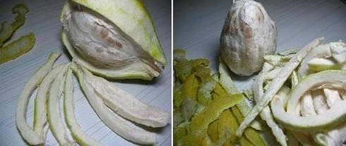 2 先將薄薄的綠皮小片或細條狀切下,會發現柚子油幾乎都集中在綠色皮中。PS:當切皮時,請小心別讓柚油噴到眼睛,手上沾滿柚油時,也別去揉眼睛,會造成嚴重的刺激,讓眼睛睜不開淚流不止,甚至抹在皮膚上也會有一股微微刺痛的感覺喔。